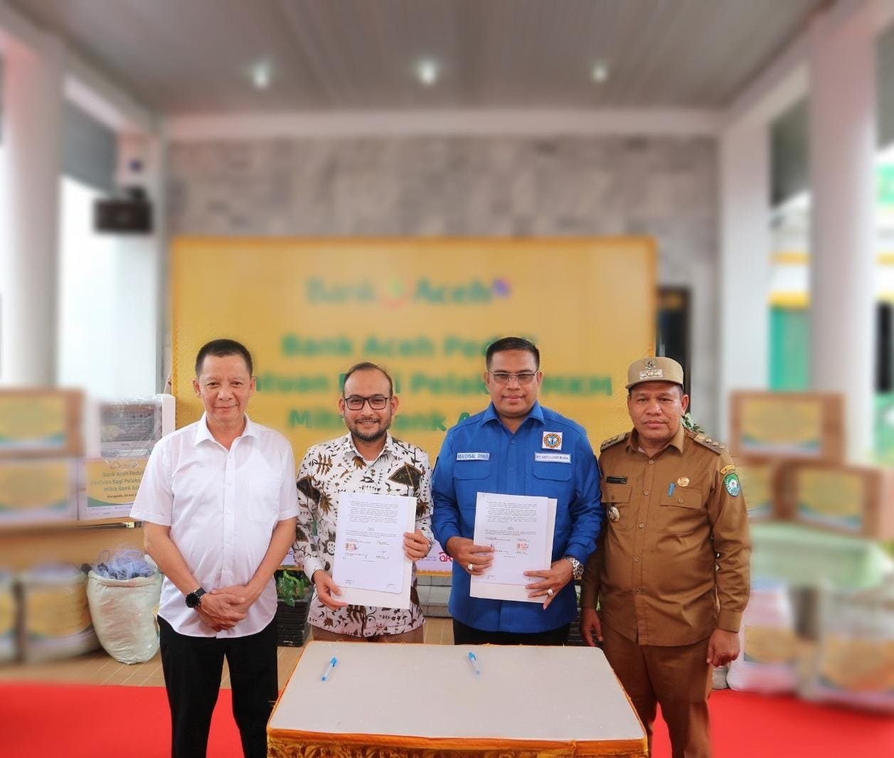 BLANGPIDIE – Direktur Utama PT Pembangunan Aceh, Ali Mulyagusdin dan Direktur Utama PT Meulugoe Raya Maidisal Diwa menandatangani Nota Kesepahaman antara PT Pembangunan Aceh (PT PEMA) dengan PT Meuligoe Raya yang disaksikan langsung oleh Pj Gubernur Aceh, Achmad Marzuki, dan  Pj Bupati Aceh Barat Daya, H. Darmansyah di Halaman Bank Aceh Syariah (BAS) Blangpidie, Selasa (9/5/2023).